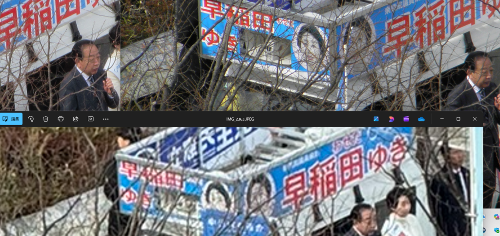 大きめにしていますが、上からとりました。上の右がSP-600UZ、上の左がIXY650、そして下がiphone15proMAXです。同じ大きさにすると望遠ではまだまだデジカメが優位に立ちます。IXYは小さくても12倍光学ズームでやはり鮮明です。野田さん禿げてないですね。